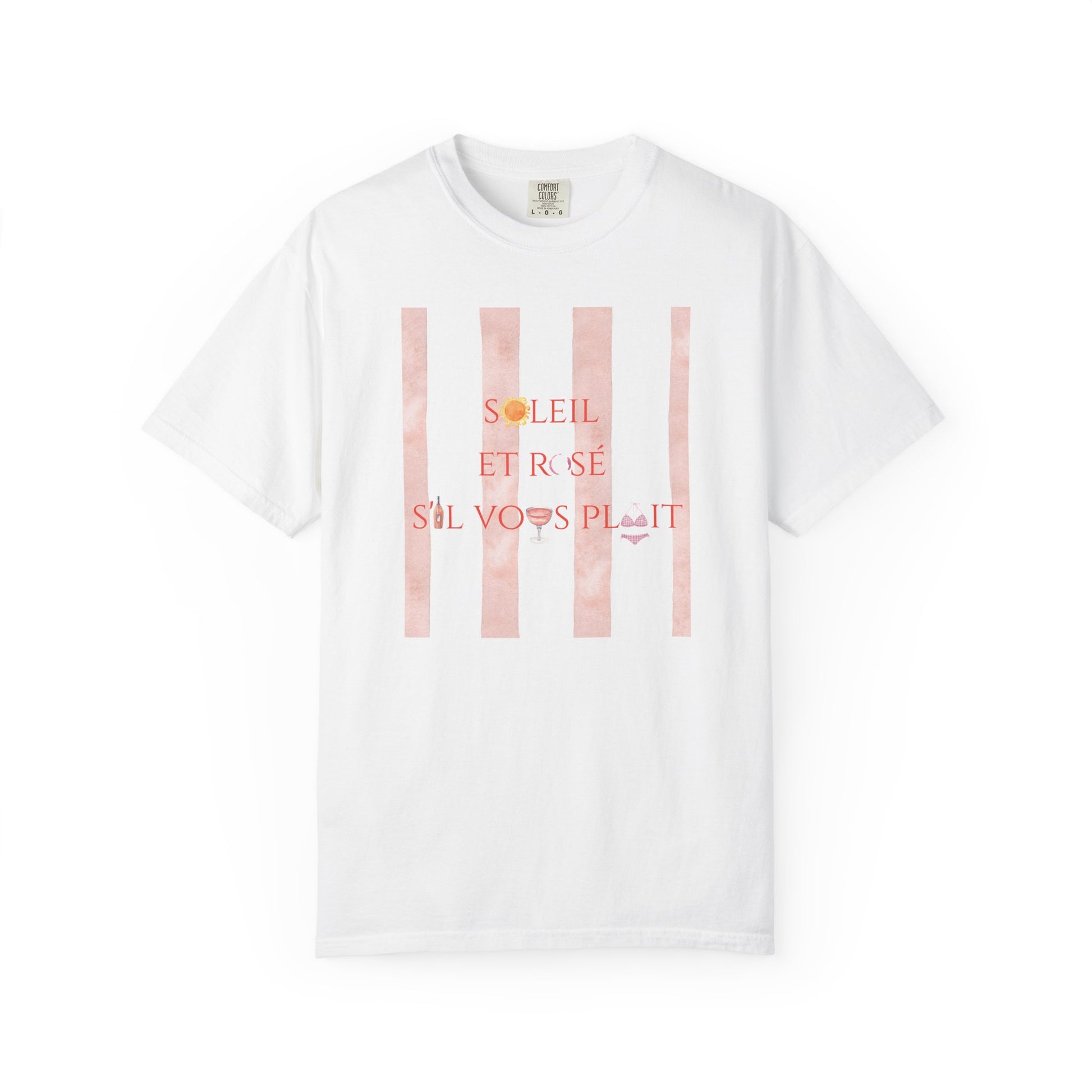 Wear these phrases for your favorite places. Perfect for travel, France, and rosé wine lovers, this shirt features French words for 'sun and a rosé please.' ☀️