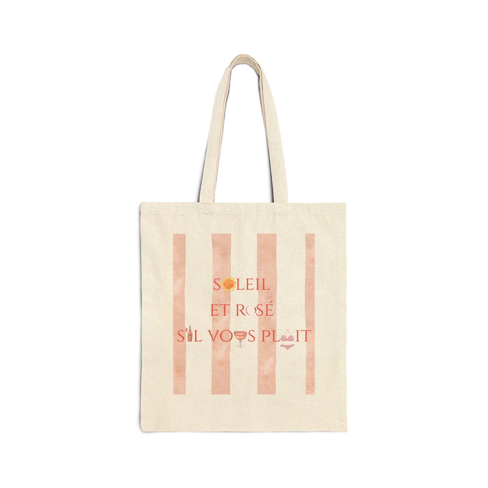 This cotton tote bag is perfect for lovers of France, rosé, and French culture. Featuring French words for sun, and a rosé please, this tote exudes a summer and travel-friendly vibe. Ideal for those who enjoy traveling to France or appreciate summer and a rosé.
