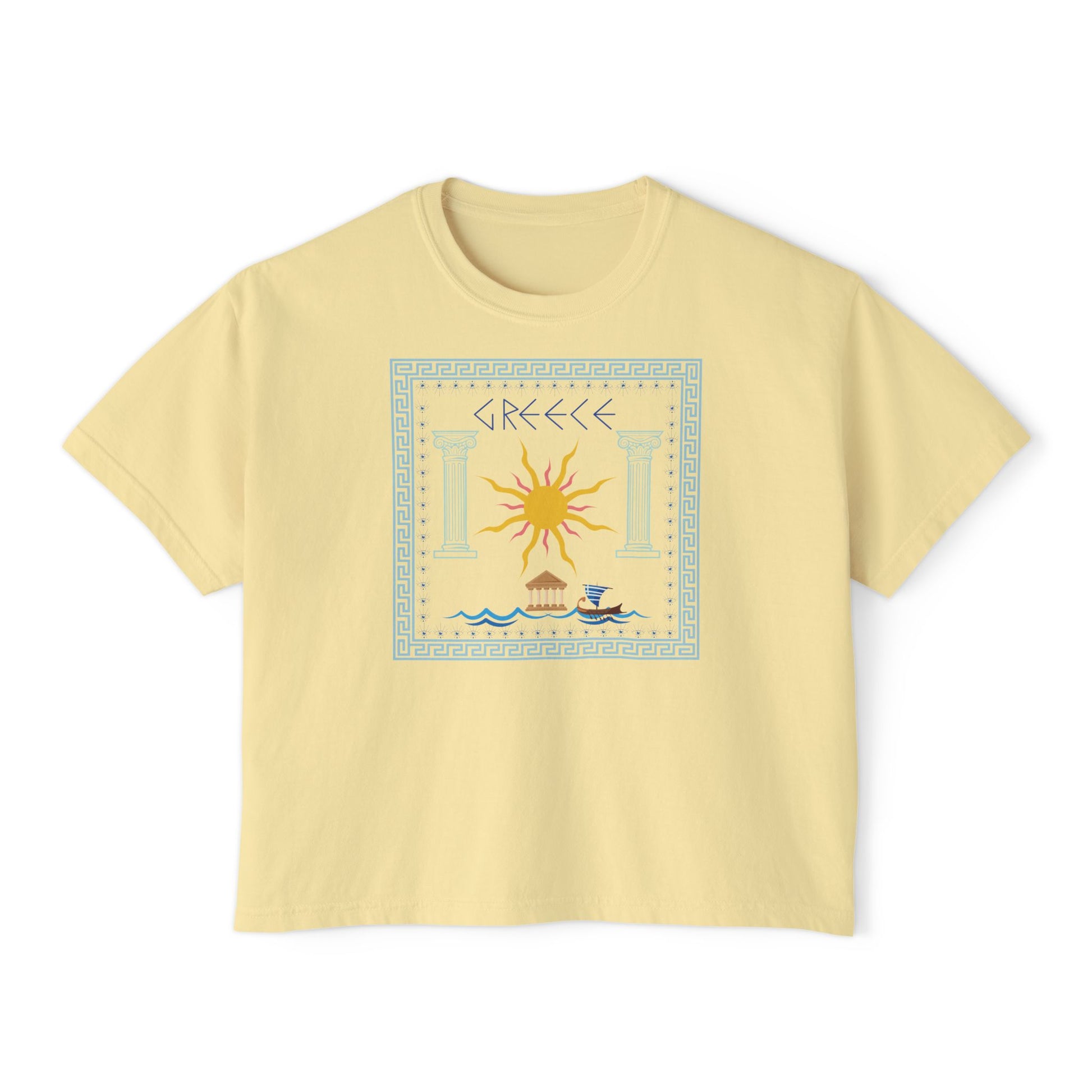 Greek Summer Boxy Graphic Tee, Summer Greece Travel Theme- Women's Relaxed Short Sleeve Fit T-Shirt