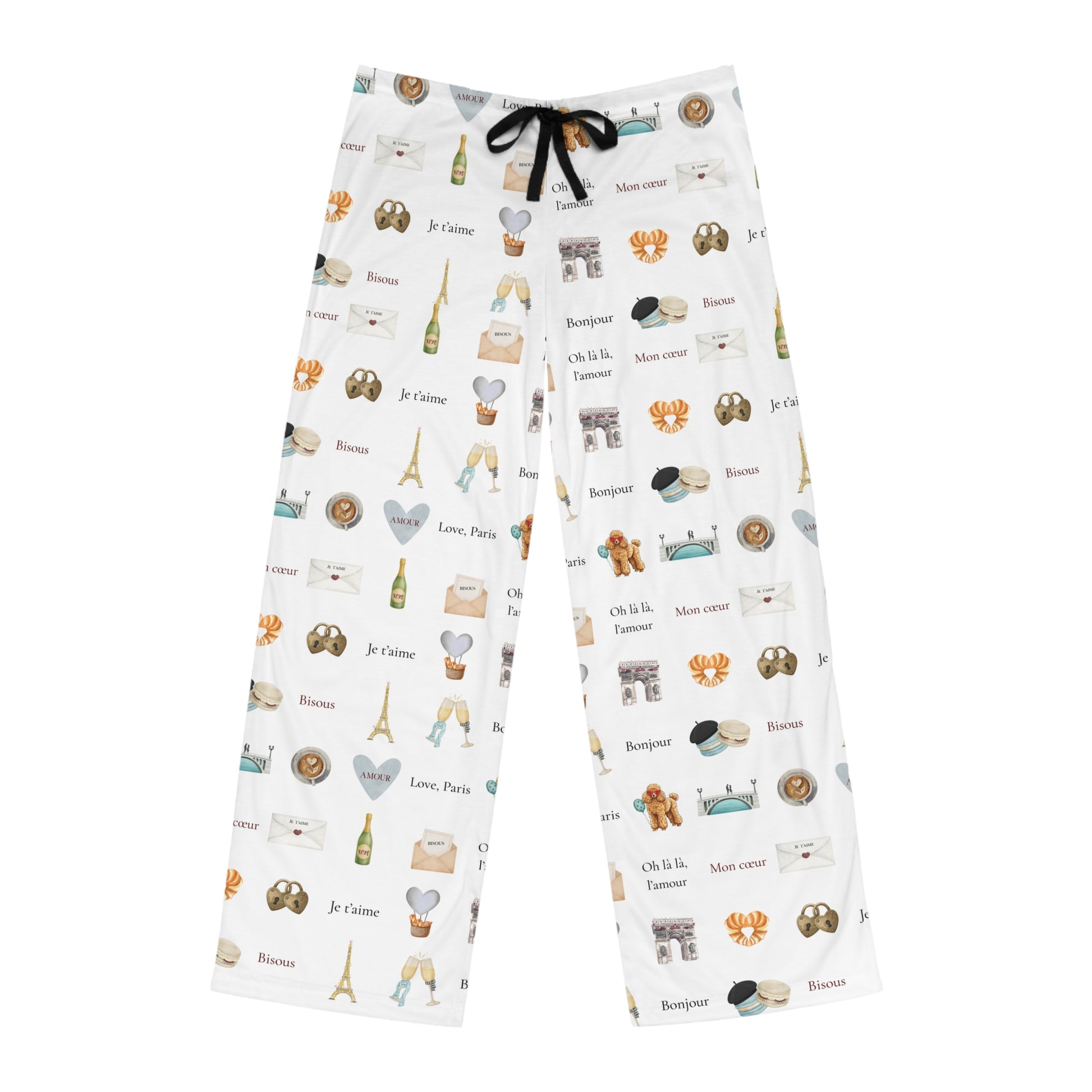 Product features - Soft 100% polyester jersey for bright, crisp print and lightweight comfort - All-over print covers the entire garment with Paris-themed motifs - Relaxed comfort fit with back elastic and adjustable black drawstring waist - Durable double-needle stitching on all seams and white seam thread - Lightweight fabric (6 oz/yd²), sewn-in care label, assembled in the USA Care instructions - Do not dryclean - Do not iron - Tumble dry: low heat - Do not bleach - Machine wash: cold (max 30C or 90F)