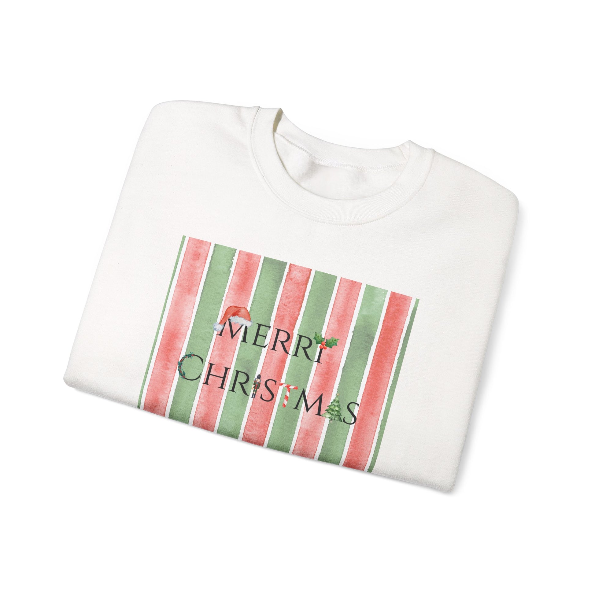 Perfect for holiday lovers, this crewneck sweatshirt features a playful 'Merry Christmas' graphic and stripes.🎄
