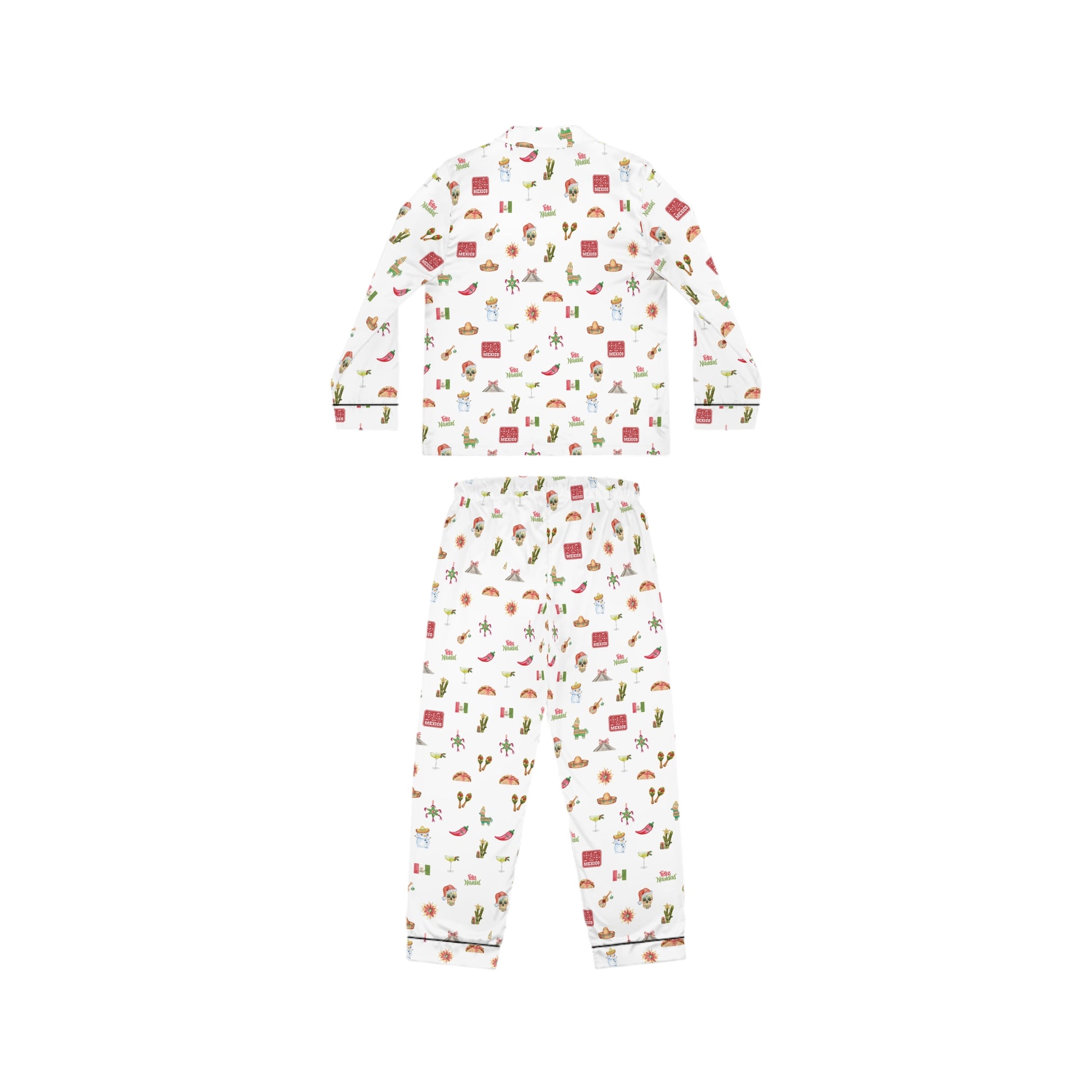 Holiday in Mexico! Enjoy the holidays with these charming women's Christmas satin pajamas. Perfect for sipping coffee on a lazy Sunday or having a cozy holiday at home. Also available in margarita green. Product features - Drawstring waist for a customizable fit - Classic notch lapel collar adds timeless style - Ultra-soft satin texture for ultimate comfort - Blend of 95% polyester and 5% spandex for flexibility - Carefully matched seam thread and trim for a polished look Care instructions - Do not dryclean - Iron, steam or dry: low heat - Drip dry - Do not bleach - Machine wash: cold (max 30C or 90F)