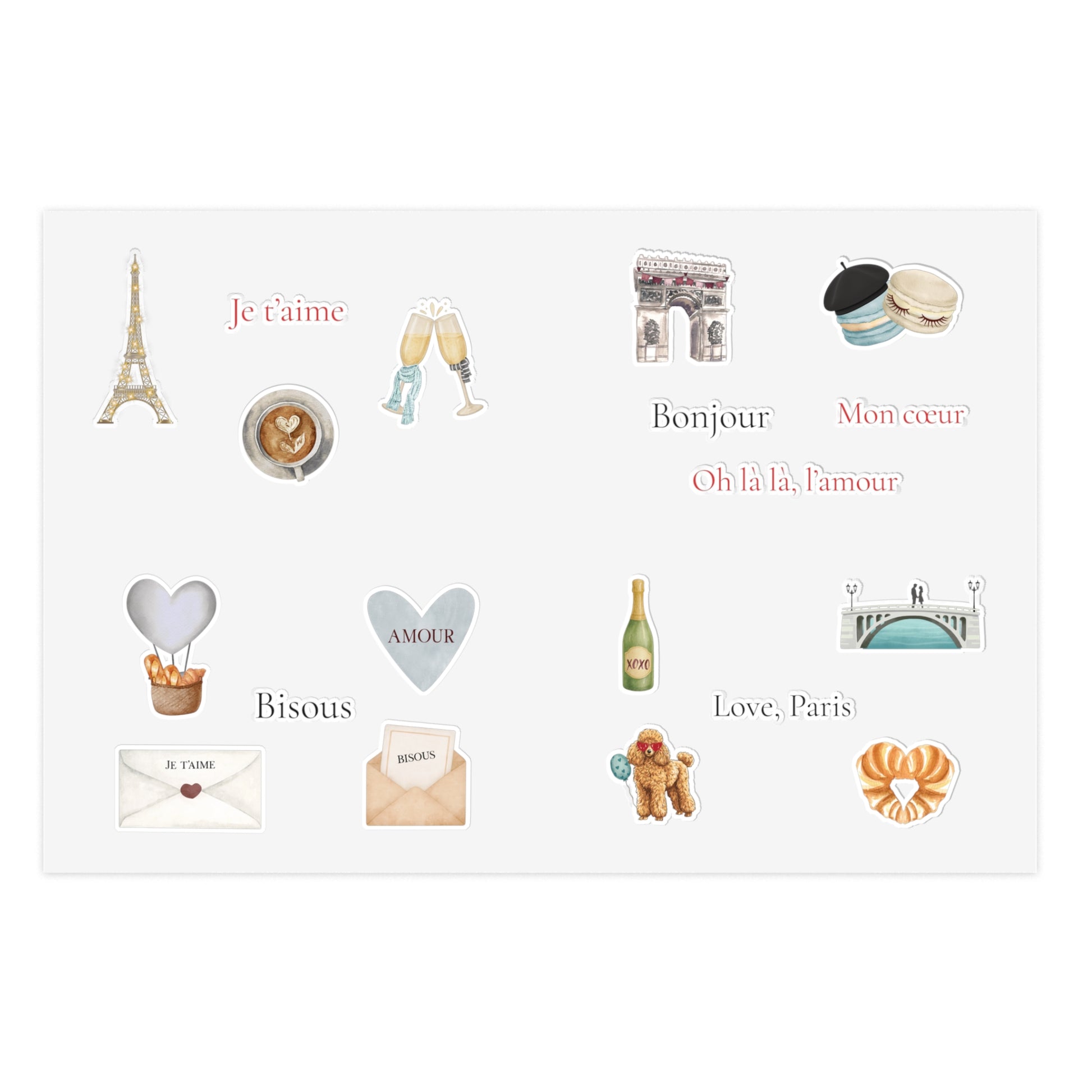 Each sticker sheet features dainty illustrations (Eiffel Tower, Arc de Triomphe, clinking champagne flutes, and colorful macarons)